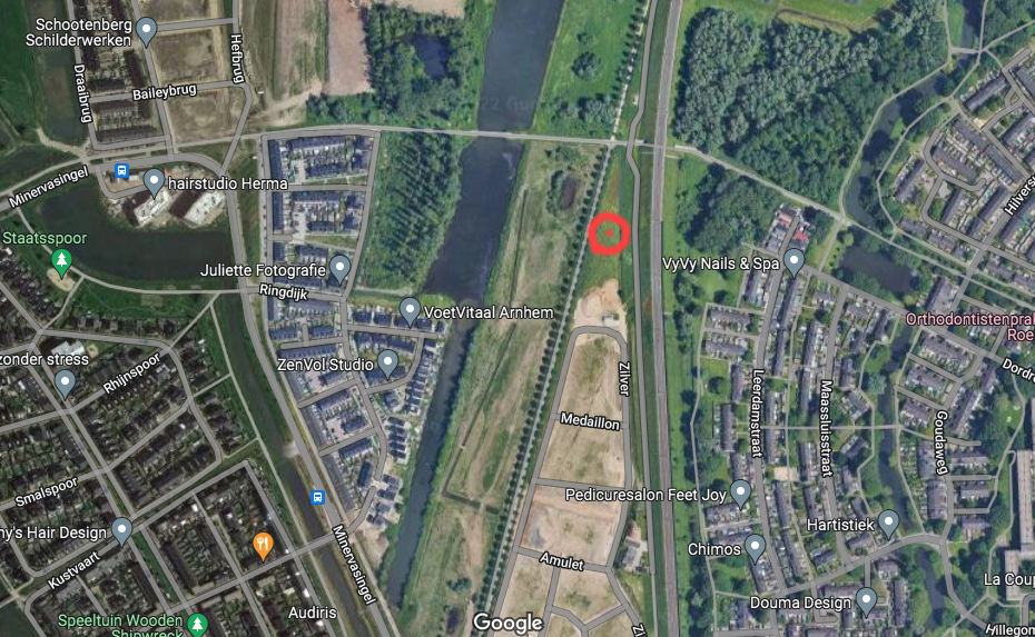 Locatie: op de kruising met fietspaden en spoor, nabij Station Zuid en aan het eind van de straat Zilver in Schuytgraaf.