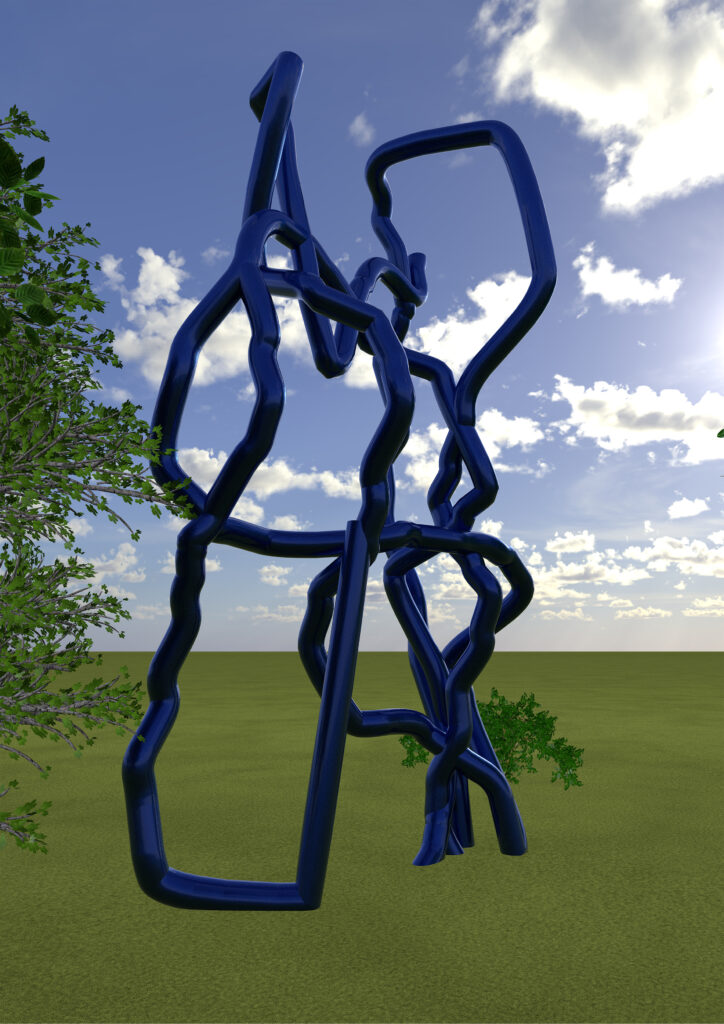 Naast het spoor, tussen de Rijn en station Arnhem Zuid, rijst een acht meter hoog sculptuur op. Een abstracte, grillige buis die alle kanten op gaat, als een driedimensionale krabbel. Het diepe, Perzische blauw contrasteert fel met het groen en bruin dat de omgeving domineert. Deze ‘krabbel’, een vlotte, deels onbewuste handeling, een aanzet tot een daad, idee of uitgangspunt, vormt een contrast met de planmatige, geordende opzet en inrichting van de wijk. De locatie naast het spoor is bewust gekozen. Het kunstwerk vormt een in het oog springend herkenningspunt vanuit de trein. Vanuit het raam in de trein leest het werk misschien tweedimensionaal, als een omlijste abstracte tekening of handtekening.