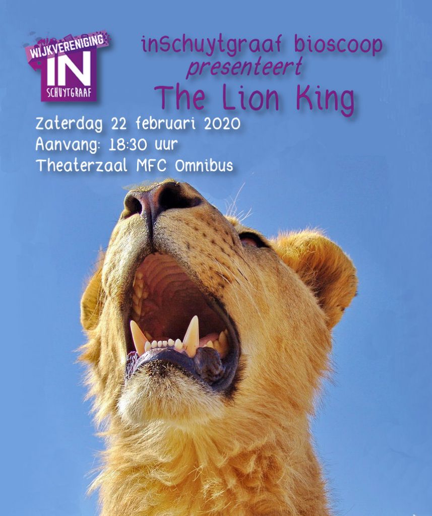 Op veler verzoek wordt er een tweede inSchuytgraaf bioscoop georganiseerd. Op zaterdag 22 februari laat Wijkvereniging inSchuytgraaf de levensechte animatiefilm “The Lion King” zien in de theaterzaal van MFC Omnibus. Het is een live-action film gebaseerd op een sprookje, maar wel met spannende ontmoetingen en achtervolgingen.