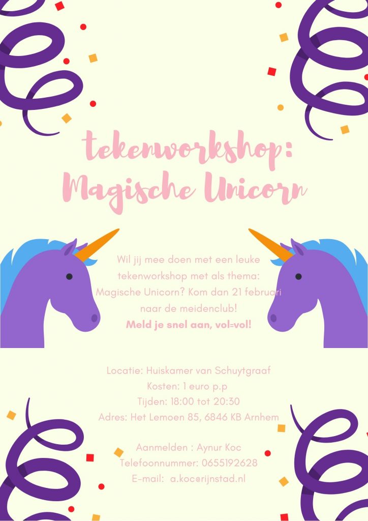 Wil je mee doen met een leuke tekenworkshop met als thema Magische Unicorn (eenhoorn)? Kom dan ook op 21 februari! Vol is vol.