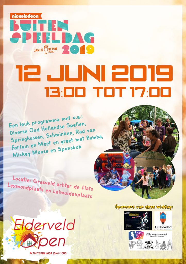 De werkgroep Elderveld Open van het Wijkplatform Elderveld is weer druk met het organiseren van de Nationale Buitenspeeldag op 12 juni 2019. Vanaf 13:00 uur tot 17:00 uur kunt u terecht op het grasveld achter de flats Leimuidenplaats en Lexmondplaats. Er zullen hier diverse activiteiten zijn voor kinderen