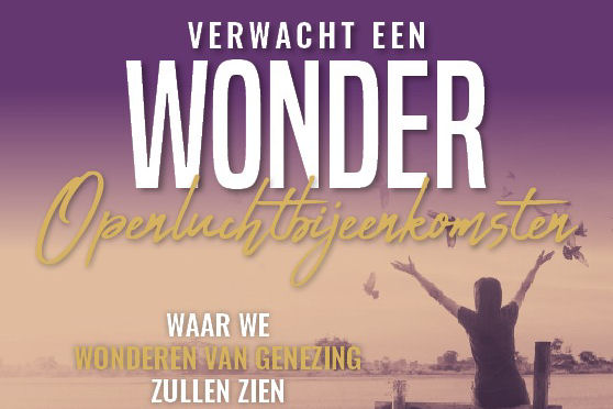 “Verwacht een wonder” organiseert in samenwerking met “Evangeliegemeente De Deur” een openluchtbijeenkomst. Het is voor iedereen toegankelijk. Het motto is: “Ben je ziek of heb je en andere nood? Kom en zie wat God voor je kan doen”.