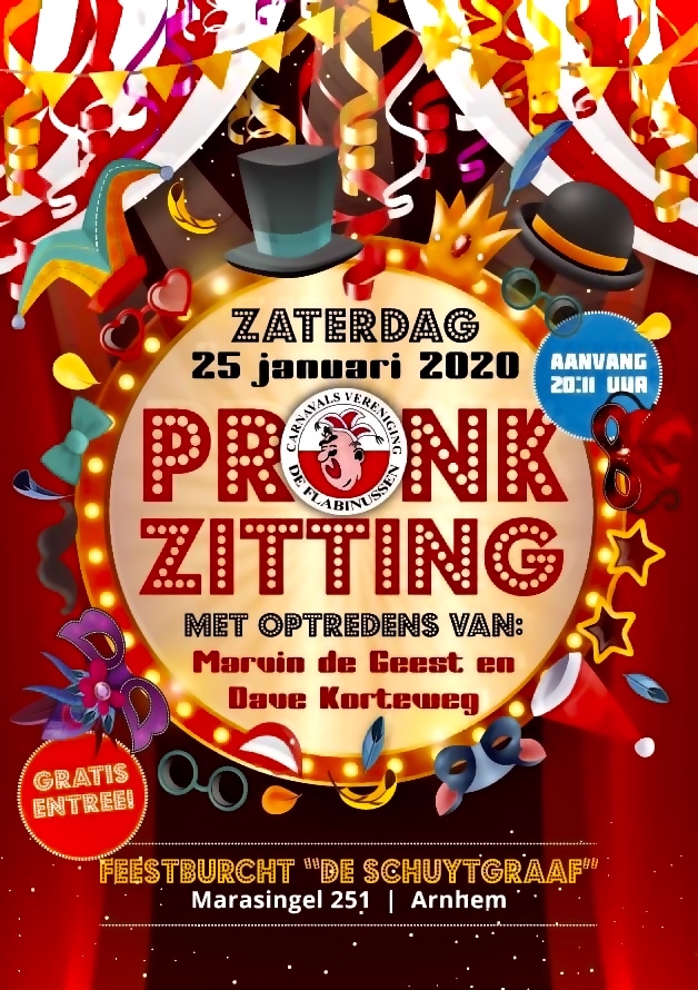 De jaarlijkse Pronkzitting van C.V. De Flabinussen in de Feestburcht in Schuytgraaf met medewerking van Marvin de Geest en Dave Korteweg.
