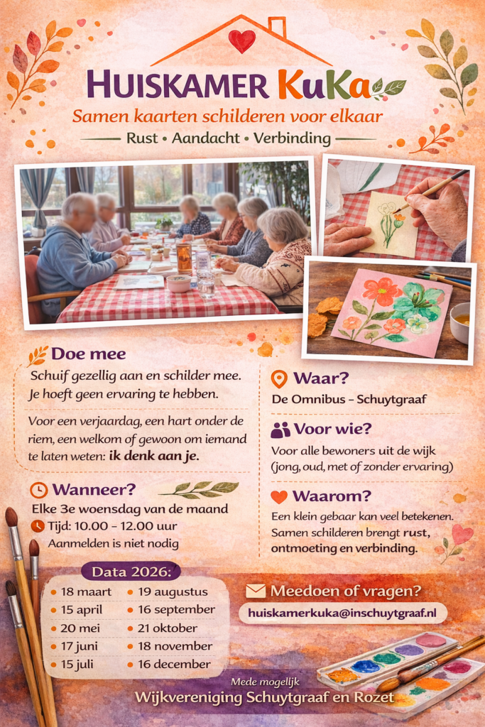 Huiskamer KuKa (KunstKaarten) organiseert elke 3e woensdag van de maand activiteiten. Schuif aan en schilder mee. Ervaring is niet nodig en iedereen kan aansluiten.