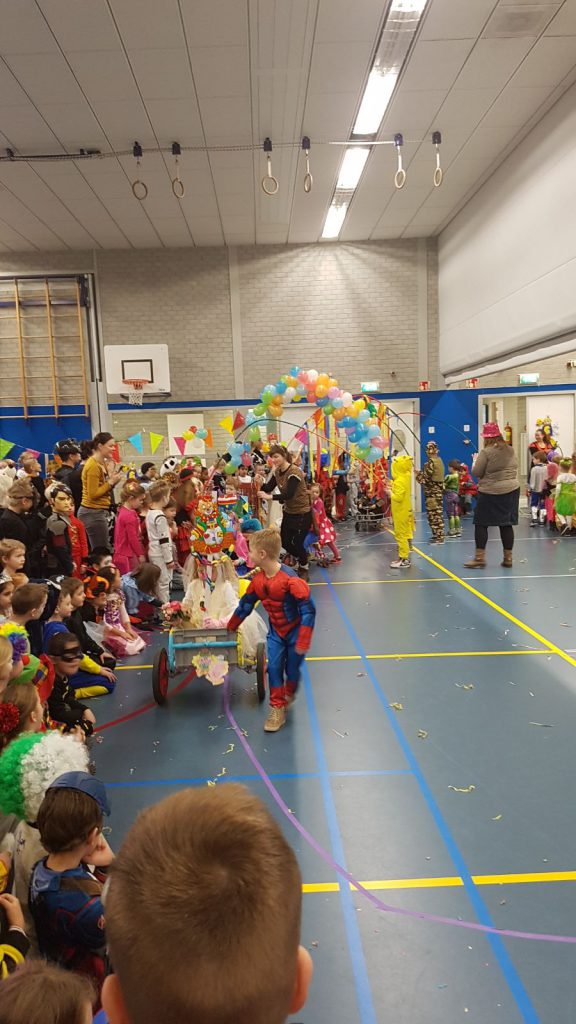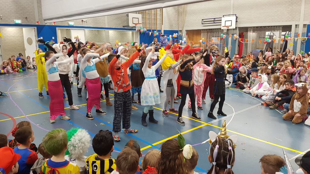 De optocht met de door de kleuterklassen feestelijk versierde praalwagens onder de prachtige bogen van de groepen 3/4 door paste weer goed binnen de Carnavalstraditie van De Arabesk. Nadat het team leerkrachten weer een heuse videoclip had gemaakt met ‘De Carnaval Knalplaat’, voerde groep 5/6 er een knallende dans op uit. De Prins en Prinses genoten er zichtbaar van, samen met alle verklede kinderen.