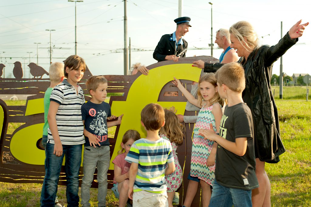 Er is duidelijk iets aan de hand in Schuytgraaf. Trommelende mensen en een politie agent die lekker rondspringt. Wethouder Ine van Burgsteden voorziet het kunstwerk op de rotonde bij het station van de letter F zodat deze nu helemaal af is.