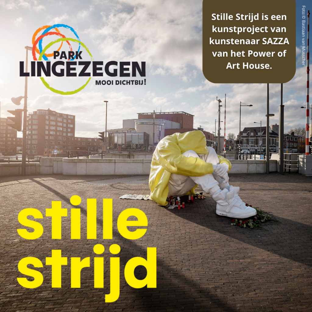 Stille Strijd is een kunstproject van kunstenaar SAZZA van het Power of Art House. Met een metershoog beeld van een ineengedoken jongere vraagt het kunstwerk aandacht voor de urgente problematiek van depressie en zelfdoding, de grootste doodsoorzaak onder jongeren onder de 30 jaar in Nederland. “Er rust een behoorlijke taboe op depressie, terwijl praten juist zo belangrijk is om het isolement te doorbreken. Dit beeld schreeuwt om aandacht.” aldus kunstenares Saskia Stolz. |