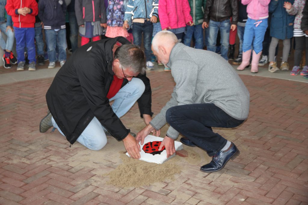 Rien van Ommeren, oud-directeur van basisschool Confetti, kreeg de tegel voor de zomervakantie als kado bij zijn afscheid. Nu heeft hij hem samen met de nieuwe directeur Ike van Houselt officieel bij het nieuwe gebouw neergelegd.