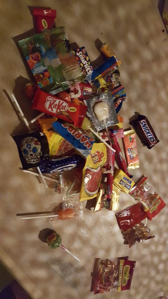 Elk jaar blijken we veel te veel snoep te hebben, dus dit jaar net iets minder ingeslagen. We dachten echt wel genoeg te hebben, maar er kwamen veel grote groepen en rond kwart over zeven sloeg de twijfel toch toe…snoepstress… Maar net toen we bedachten dat dan de koektrommel maar uitkomst moest bieden, liep het toch ten einde. Volgend jaar maar weer een paar zakken extra. De kinderen hadden in ieder geval weer veel plezier in onze mooie wijk!