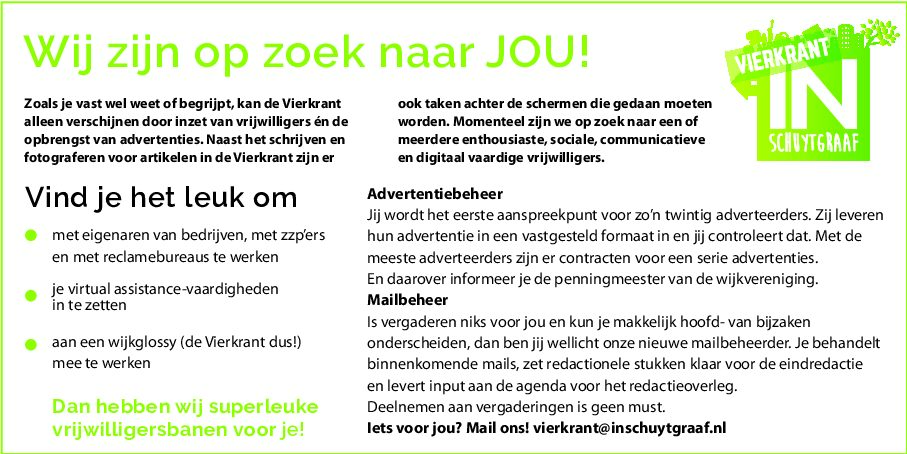 Iets voor jou? Mail ons! Vierkrant@inSchuytgraaf.nl.